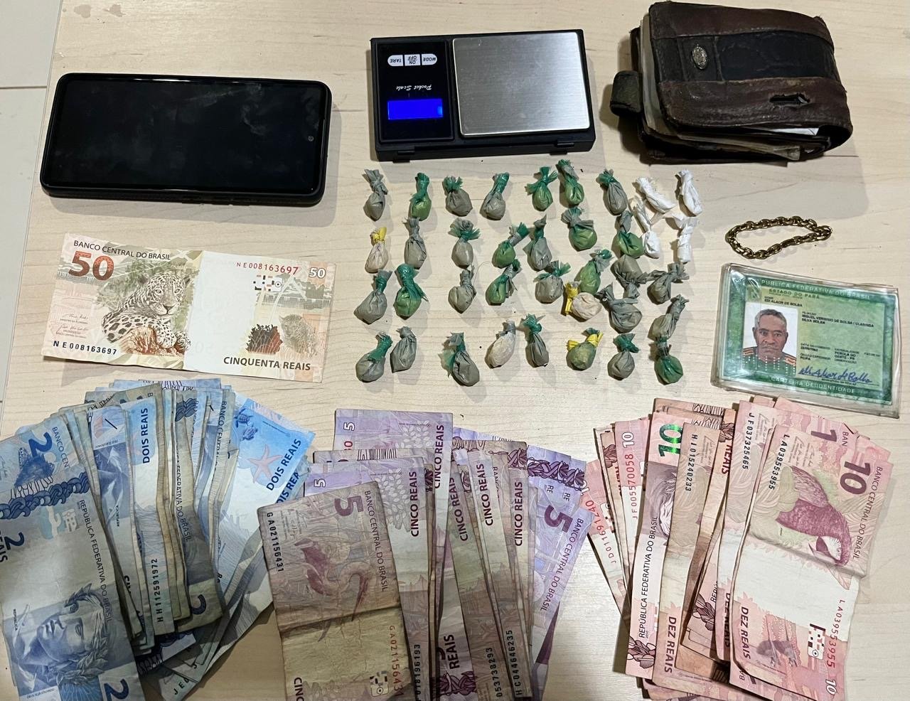 Ao ver a situação, a guarnição realizou uma revista e encontrou 37 papelotes com substância análoga a crack, totalizando 95 gramas, além de R$ 435 em dinheiro em notas de R$ 2, R$ 5, R$ 10 e R$ 50.